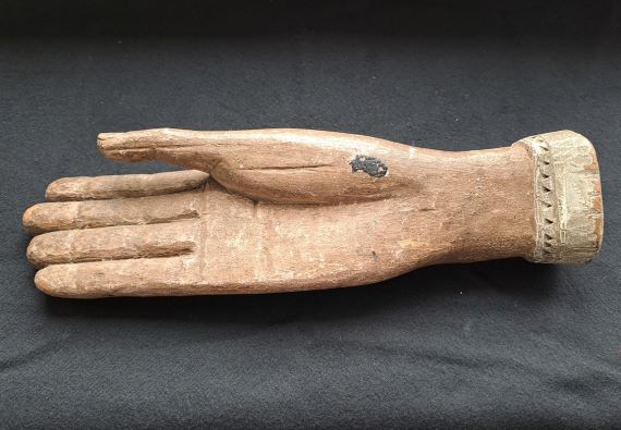 Reinhard Schartl, Vorstandsmitglied des Friedberger Geschichtsvereins, betrachtet die aus Holz geschnitzte Hand genauer und thematisiert Fragen zu deren Funktion, Alter und Herkunft.